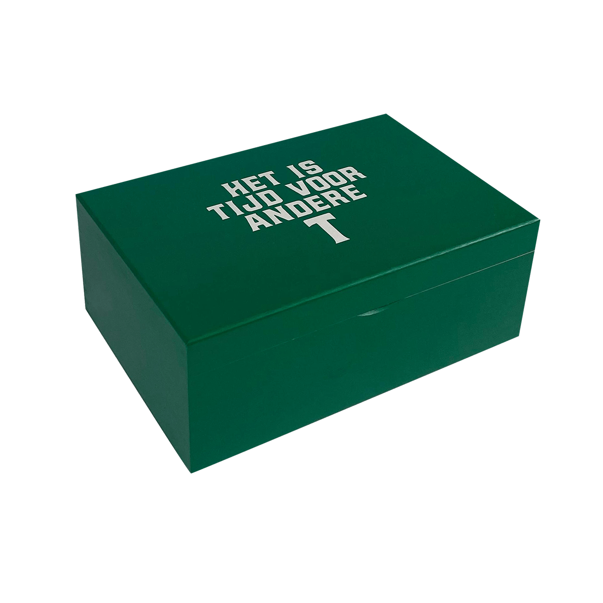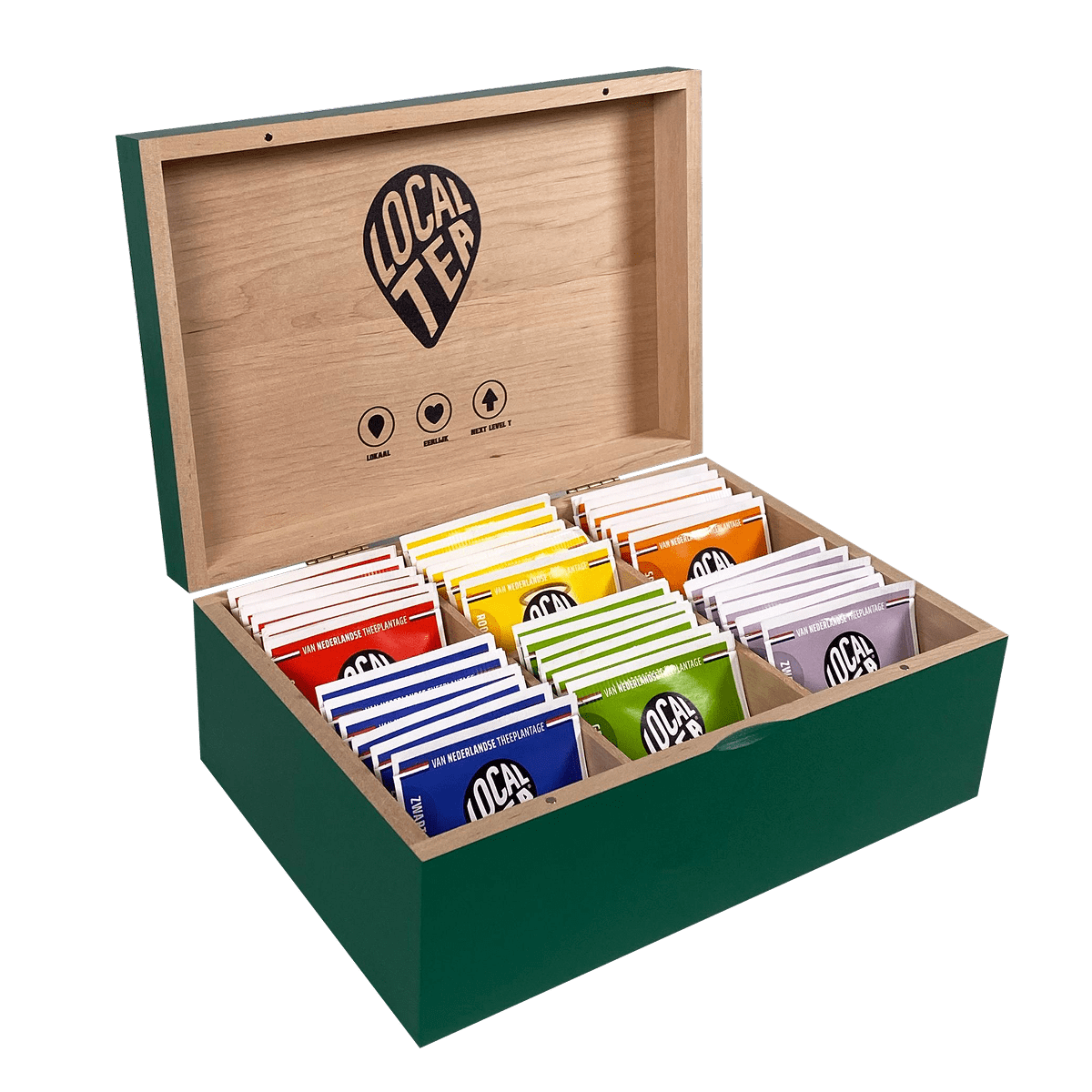 Houten theedoos met 6 vakken in een moderne groene afwerking. Bewaar je LocalTea zakjes overzichtelijk én stijlvol. Een blikvanger op elk aanrecht.